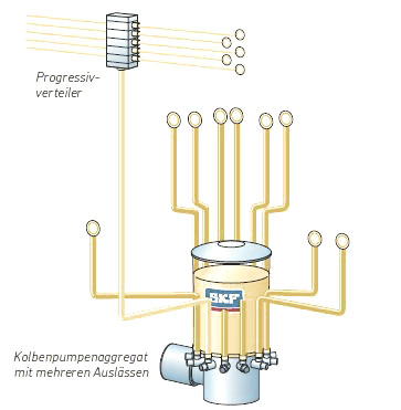 Mehrleitungspumpen können bis zu 32 separate Schmierkreise bedienen, hierbei ist jedem Abgang ein Pumpenelement / Förderkolben mit der für den Schmier- kreis benötigten Dosiermenge zuzuordnen. Gewöhnlich führt jede Schmierleitung direkt zu der entsprechenden Schmierstelle, jedoch kann jede Schmierleitung durch Progressivverteiler weiter unterteilt werden.
