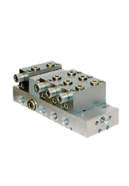 Die Basis der PSG-Progressivverteiler bildet die Grundplatte, die sowohl als Block- oder Modularvariante erhältlich ist, die Rohranschlüsse finden sich hier wieder. Dosier- und / oder Blindelemente werden auf der Grundplatte befestigt, ebenfalls werden hierauf weitere Anbauten wie z.B. Kolbendetektoren, montiert.